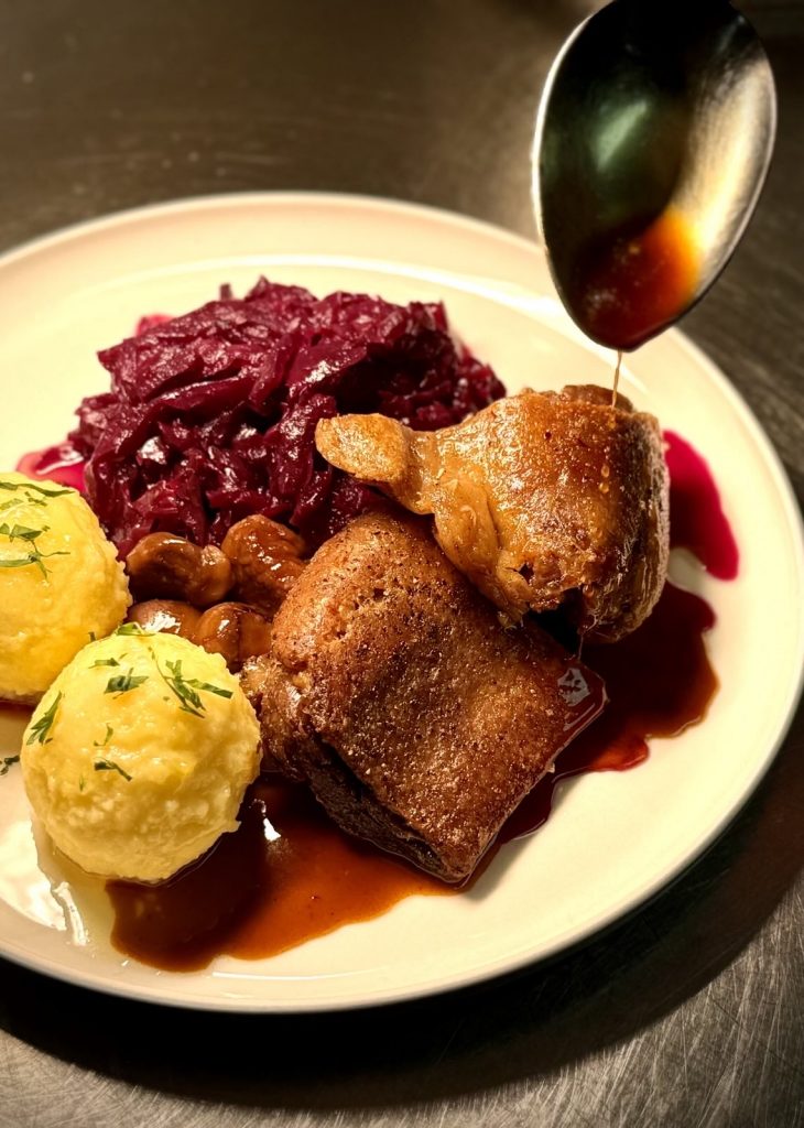 Im Advent oder zu den Weihnachtstagen – Möchtet ihr euren Gänsebraten lieber zu Hause genießen so bieten wir euch an den Gänsebraten auch fertiggestellt abzuholen oder alles so vorzubereiten, dass ihr es schnell und bequem selber zum rechten Zeitpunkt fertigstellen könnt. Eine Anleitung hierzu liefern wir selbstverständlich mit!